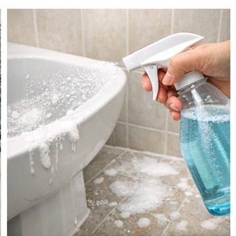 청소 전, 변기·세면대·바닥에 세정제를 미리 뿌리고 5~10분만 방치하세요.